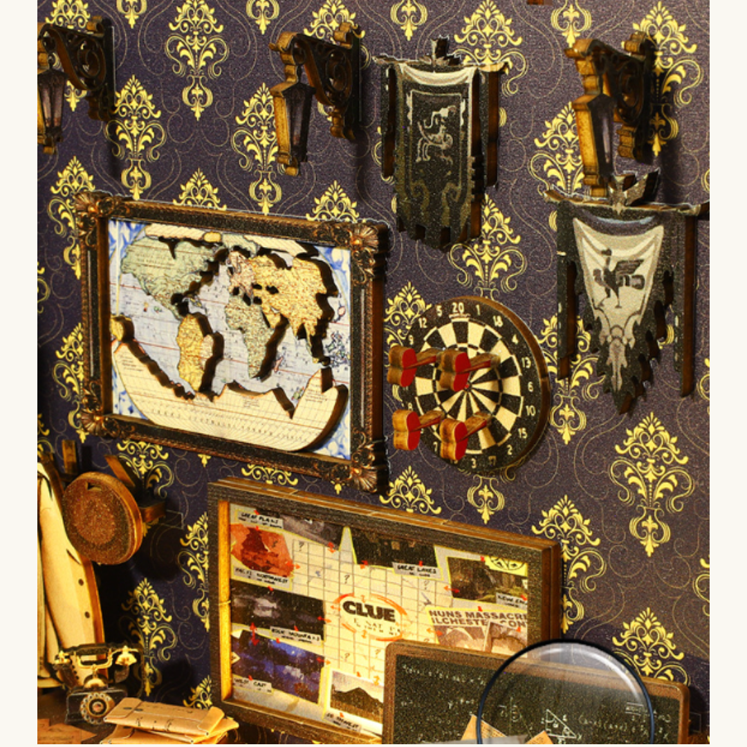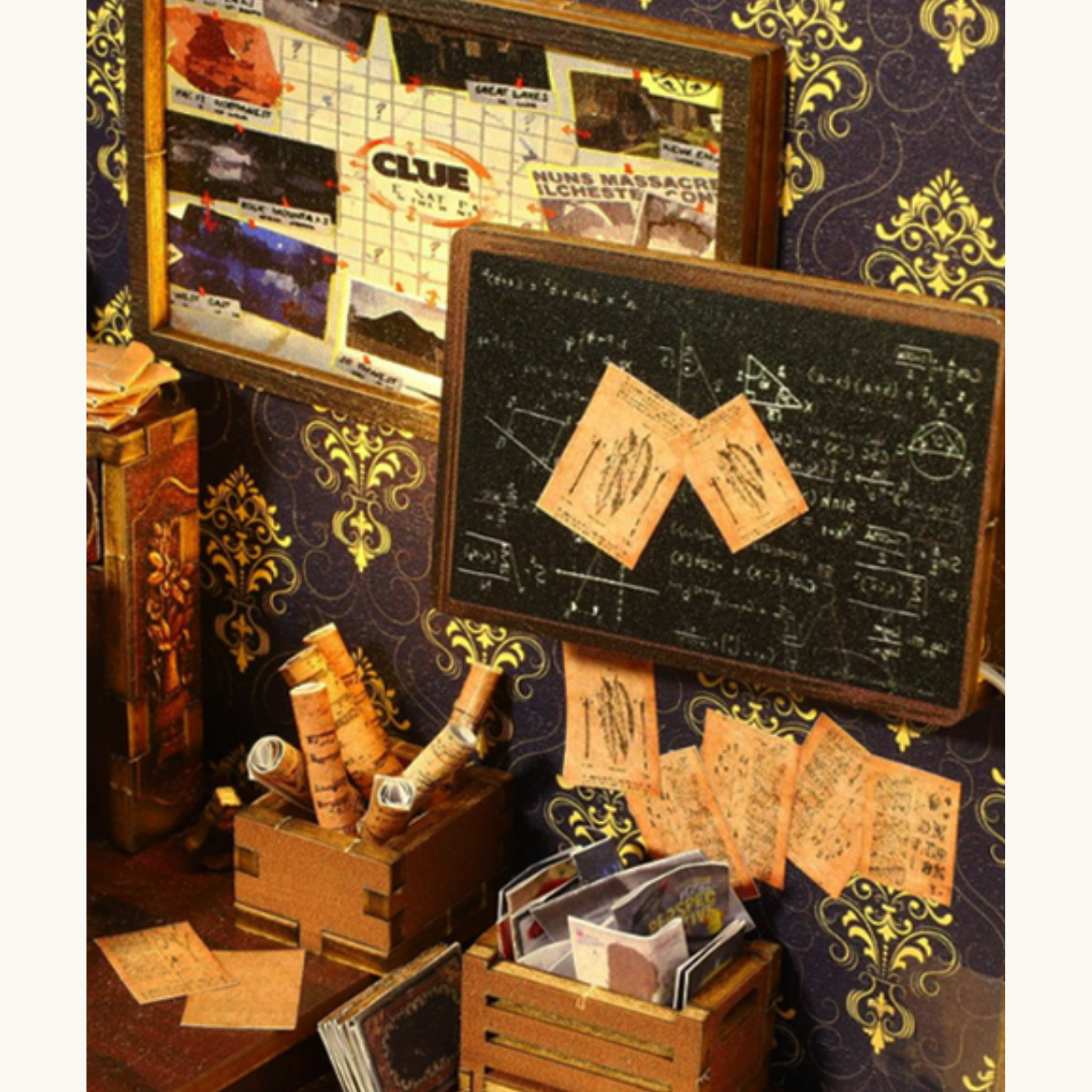 Lass dich in eine andere Zeit entführen – in ein Detektivbüro voller Rätsel, Karten mit roten Fäden, Beweismittel und geheimnisvoller Atmosphäre.