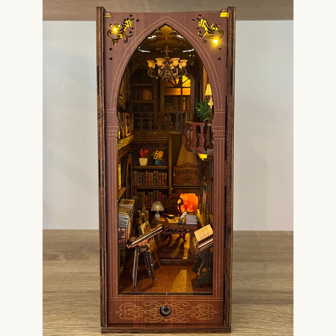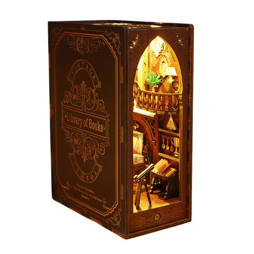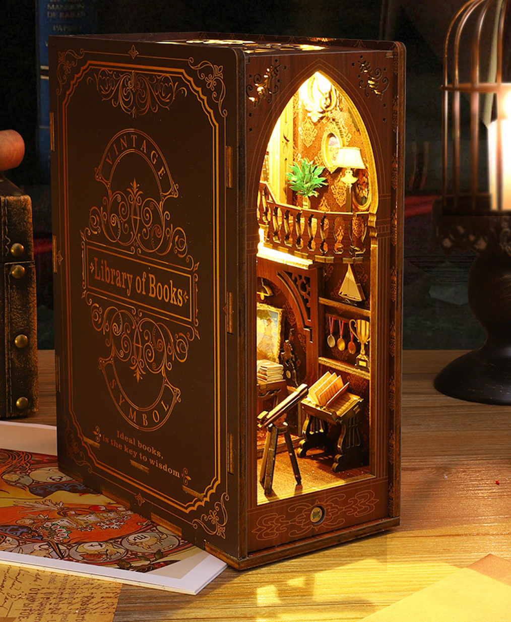 Dieses DIY-Holzsteckpuzzle verwandelt sich in eine prachtvolle Miniaturwelt mit rustikalen Holzregalen, antiken Möbeln, Globus, Gemälden und einer funkelnden Deckenleuchte.