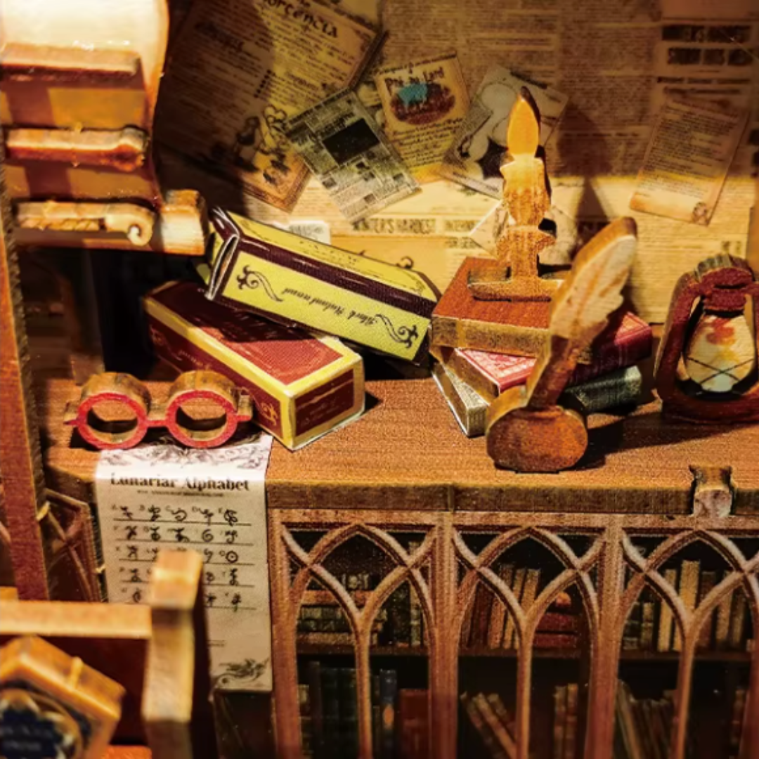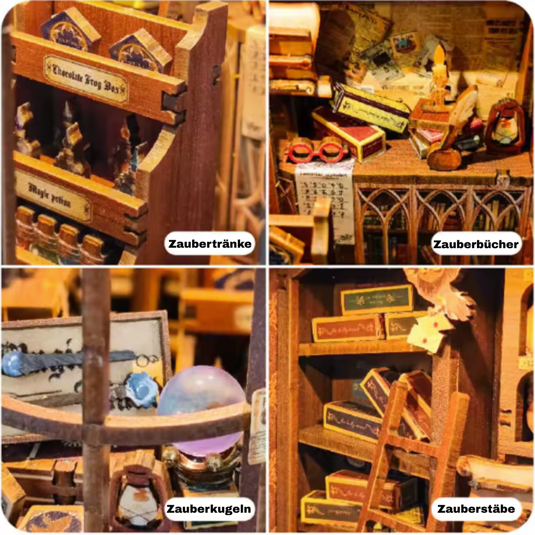 Sobald du das Licht einschaltest, wirkt die Szene wie ein Fenster in eine verwinkelte Zauberstraße: warmes Leuchten, knisternde Stimmung und überall kleine Dinge, die man erst auf den zweiten Blick entdeckt. Ein entspannendes Bastel-Erlebnis mit echtem Wow-Effekt – und die perfekte Deko für alle, die Magie lieben und ihr Regal in eine kleine Zauberwelt verwandeln wollen.